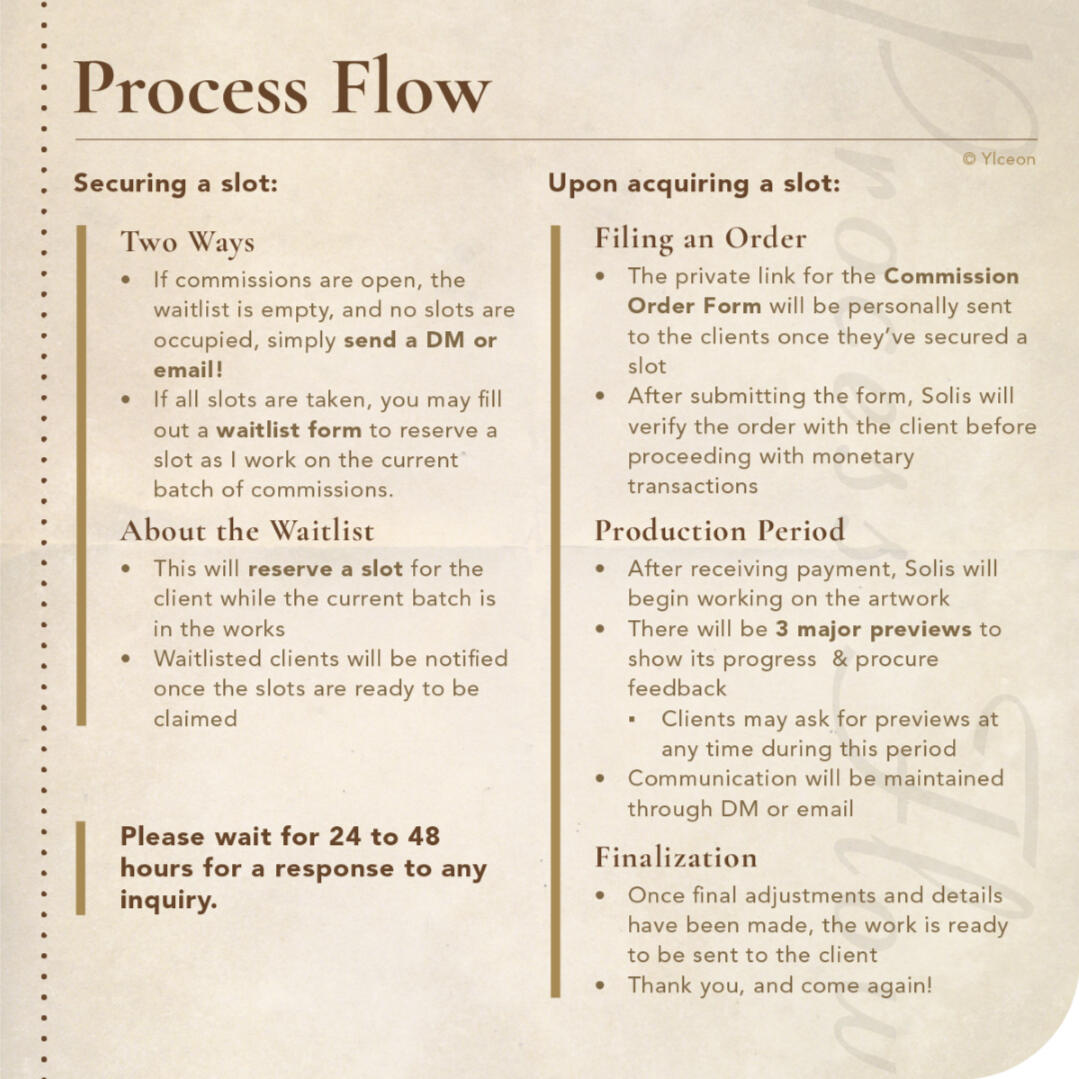 Depending on the order's complexity, the artist may take up about 1 week to create a draft, and an additional 2~4 weeks to complete the order. That said, it is still possible to have the order finished at a much earlier date